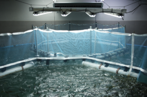 Cardumen de juveniles de pez limón en desarrollo bajo protocolos del INIDEP